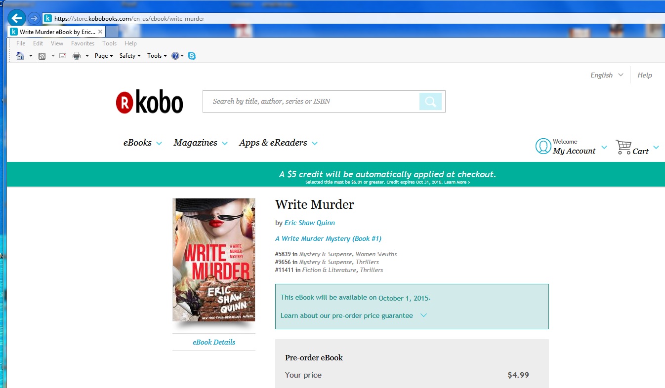 And if you’re waiting on the printed version — Me Too! It has been delivered to Amazon and should become available there very soon. If you absolutely cannot wait 1st, thank you and 2nd you can order direct from Create Space https://www.createspace.com/5748812 but your Amazon benefits won’t apply I don’t think. You can also get the book from Kobo https://store.kobobooks.com/en-us/ebook/write-murder & I promise to keep you posted and let you know as more buying options like Barnes & Noble become available. Meanwhile, enjoy! And if you feel like it, post a review on the Amazon page and tell people what you thought of the book. It’ll really help me out and I’d really appreciate it!